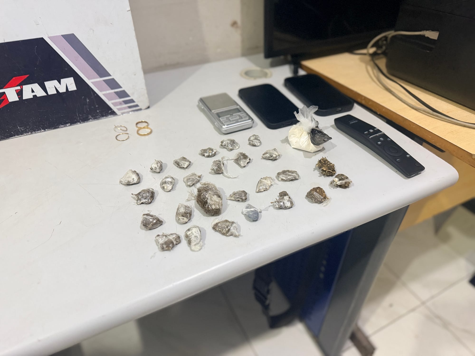 A partir das informações levantadas, as equipes chegaram até outro suspeito. Ao perceber a presença policial, ele tentou escapar, mas também foi capturado. No local indicado por ele, os agentes encontraram diversos itens roubados da vítima, além de uma quantidade significativa de entorpecentes já fracionados e prontos para comercialização, bem como uma balança de precisão.